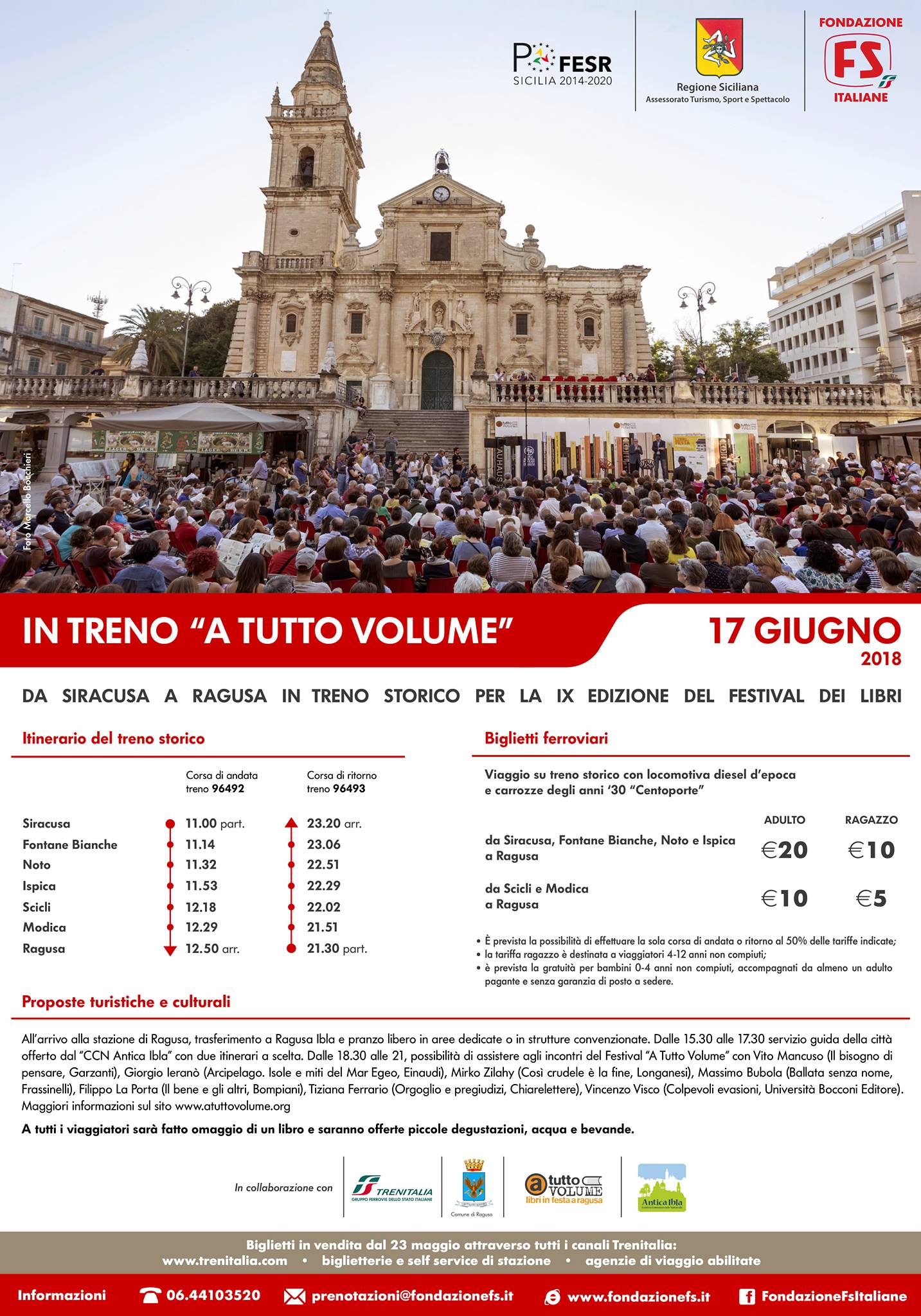 Un viaggio lungo i binari della cultura a bordo di un treno speciale, il treno “A Tutto Volume”. In occasione del festival letterario di Ragusa, in programma questo fine settimana da venerdì 15 a domenica 17 giugno, è stato predisposto un treno speciale che porterà i visitatori e gli appassionati di libri da Siracusa a Ragusa per poi far ritorno in tarda serata.