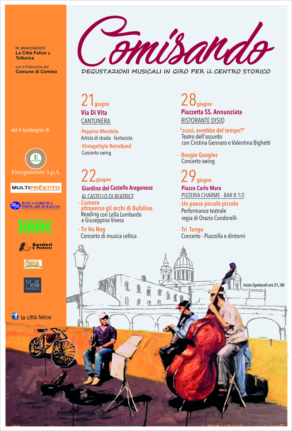 Comisando continuerà giovedì 28 Giugno nello slargo di via SS. Annunziata, vicino al Ristorante Disio con scusi avrebbe tempo?Teatro dell’assurdo con Cristina Gennaro e Valentina Bighetti e a seguire i Boogie Googles concerto swing.  Il 29 Giugno la serata conclusiva, in piazza Carlo Marx nei pressi dell’ex manifattura tabacchi in collaborazione con Charme Maison della pizza e Otto e ½ Cafè, con “Un paese piccolo piccolo” performance teatrale Regia di Orazio Condorelli e a seguire il concerto dei Tri TangoPiazzolla e dintorni.