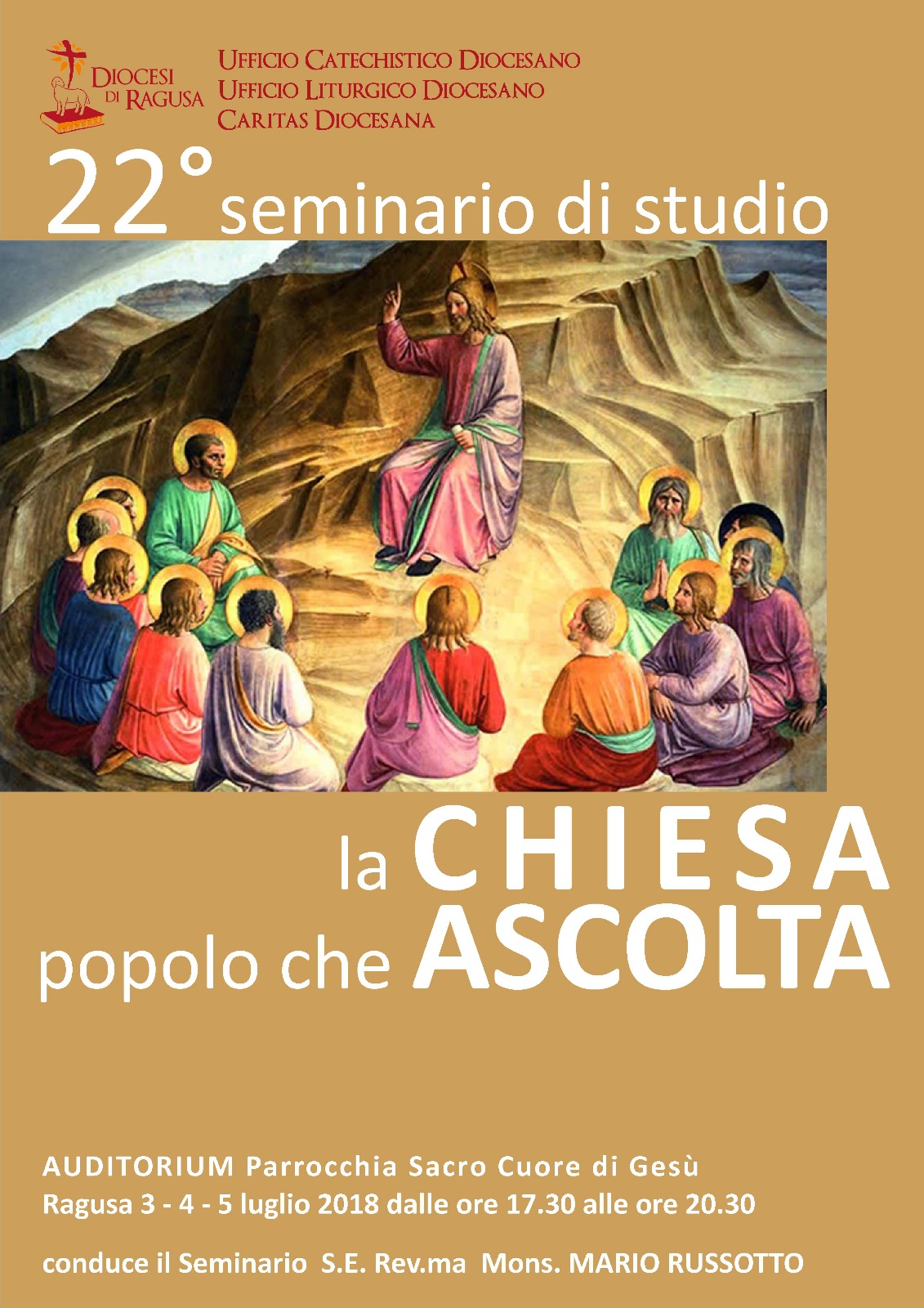 Sarà il vescovo di Caltanissetta, monsignor Mario Russotto, a condurre il seminario ‘‘La Chiesa popolo di Dio che ascolta’’, in programma dal 3 al 5 luglio nell’auditorium della parrocchia Sacro Cuore (ex Gesuiti) di Ragusa. L’iniziativa è promossa dall’ufficio Catechistico, dall’ufficio Liturgico e dalla Caritas della Diocesi di Ragusa.