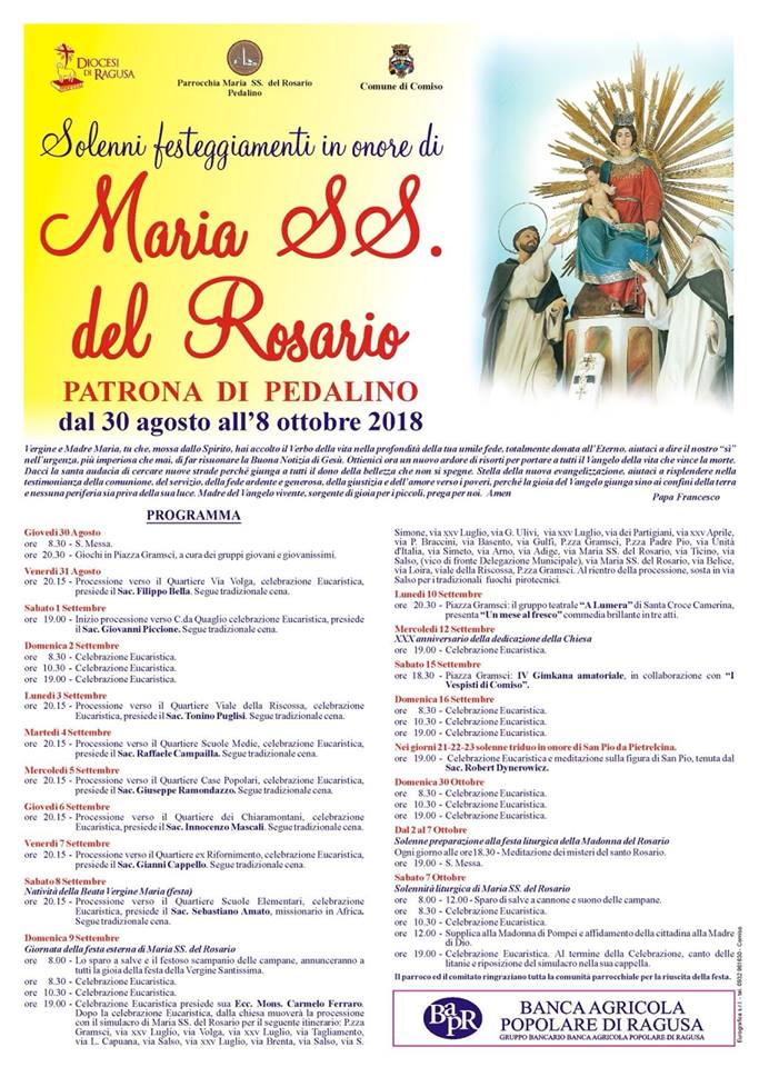 Da venerdì 31 continueranno i festeggiamenti, ogni sera un piccolo simulacro della Vergine Santa raggiungerà un quartiere della frazione e c/da Quaglio, dove sarà celebrata la Santa Messa e a seguito si terrà la tradizionale cena con la vendita all’asta dei doni preparati dagli abitanti dei quartieri. In particolare in c/da Quaglio condivideranno la serata la comunità di Pedalino con quella della vicina Parrocchia di Roccazzo. Il momento centrale della festa è previsto per domenica 9 settembre, giornata in cui il simulacro della Madonna del Rosario verrà portato in processione per tutte le strade di Pedalino. Durante i festeggiamenti previsti anche qualche momento collaterale, lunedì 10 settembre, commedia teatrale in piazza Gramsci, sabato 15 settembre IV Gimkana amatoriale delle storiche vespe. Si concluderà il 7 ottobre giornata della solennità liturgica della Madonna del Rosario. La festa della Madonna di Pedalino è un momento molto sentito in quanto tutti i cittadini in un clima di fede e semplicità si uniscono e collaborano, per onorare la Patrona della comunità.