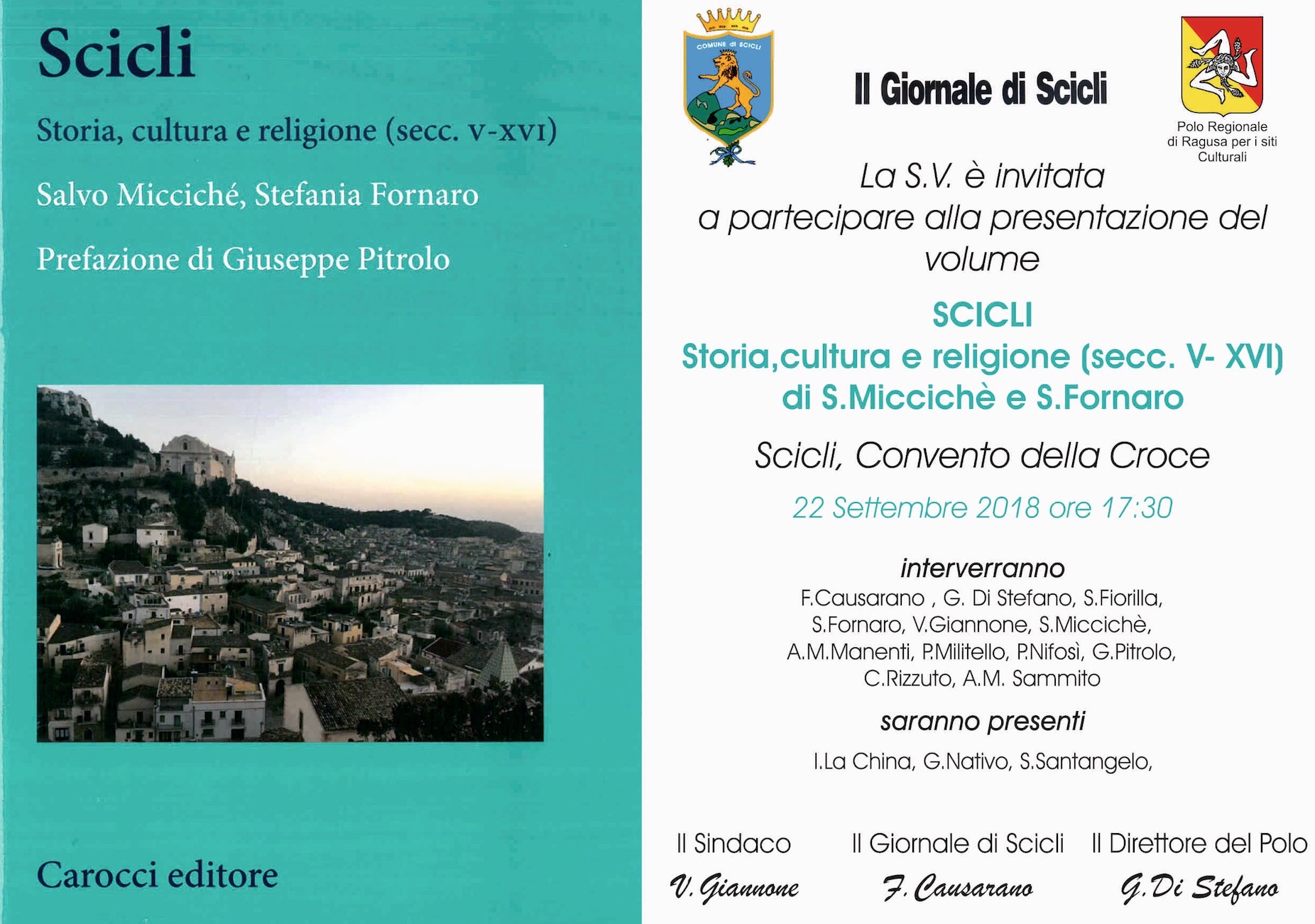 Il nuovo libro “Scicli. Storia, cultura e religione (secc. V-XVI)” (di Salvo Micciché e Stefania Fornaro, Carocci editore 2018) sarà presentato sabato 22 settembre alle ore 17.30 a Scicli, presso il Convento di Santa Maria della Croce. L’evento è promosso a cura del Polo Regionale di Ragusa per i siti culturali in sinergica collaborazione con il Comune di Scicli e “Il Giornale di Scicli”.
