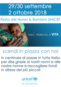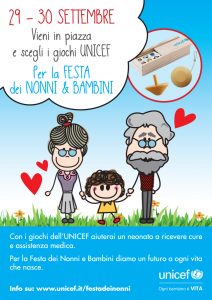 I prossimi 29 e 30 settembre, l’Unicef Italia, grazie alla mobilitazione di oltre 1.500 volontari dei Comitati locali, torna in oltre 400 piazze in Italia per celebrare la Festa dei Nonni (2 ottobre) con tante iniziative e attività e per sostenere la campagna “Ogni bambino è Vita”: ogni anno nel mondo 2,6 milioni di neonati non sopravvivono al primo mese di vita, in media sono 7.000 ogni giorno; 1 milione di bambini muore nello stesso giorno in cui viene alla luce. La celebrazione UNICEF della festa dei nonni e bambini continua anche il 2 ottobre con attività ed eventi promossi da scuole, aziende ed altri enti.