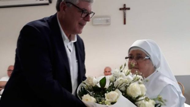 (in foto: Suor Apollonia riceve un omaggio floreale dal Direttore Sanitario del Guzzardi di Vittoria – credito fotografico Don Giuseppe Riggio)