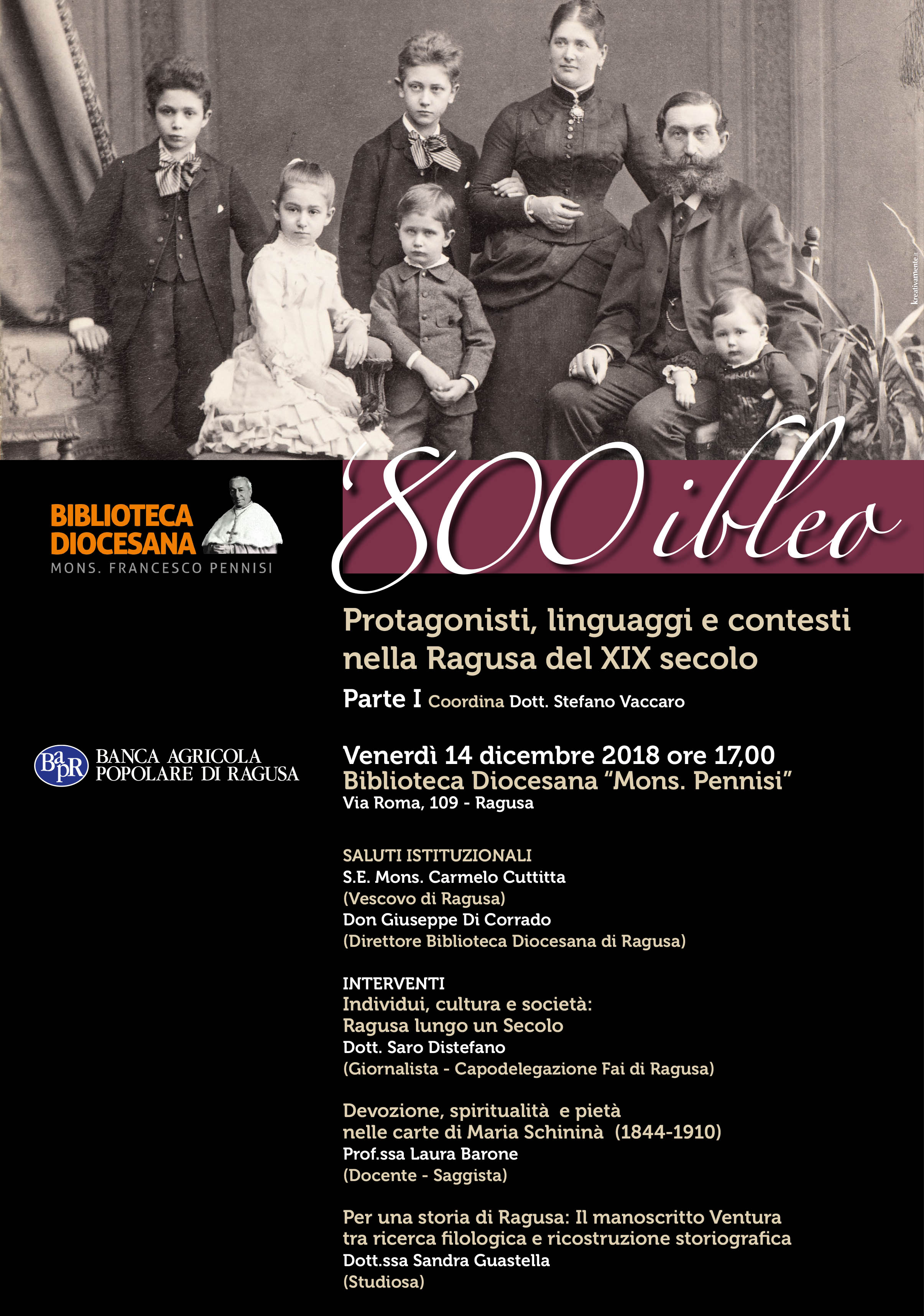 L’appuntamento è fissato per venerdì 14 dicembre 2018, alle ore 17:00, presso la Biblioteca Diocesana Mons. Francesco Pennisi, a Ragusa.