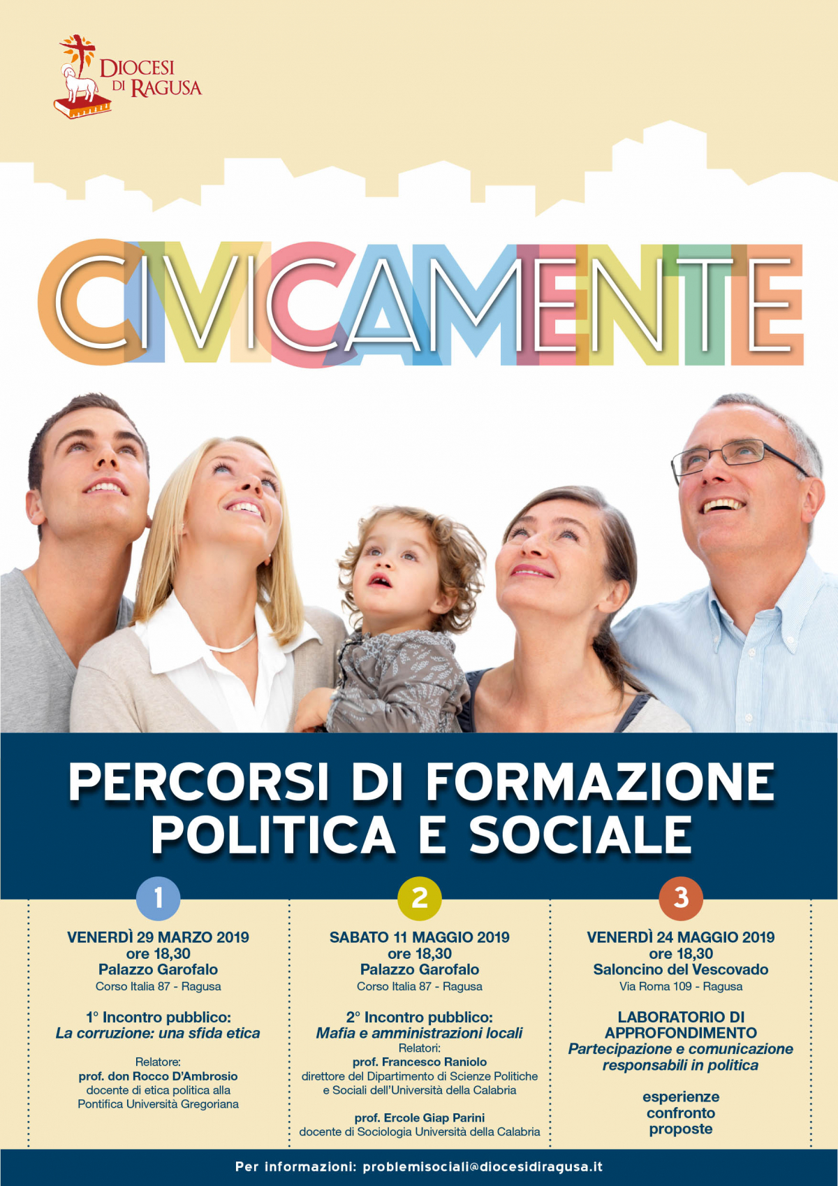 Le iscrizioni a “Civicamente. Percorsi di formazione politica e sociale” saranno raccolte durante o dopo gli incontri pubblici, oppure inviando una email a problemisociali@diocesidiragusa.it, entro il 20 maggio 2019.