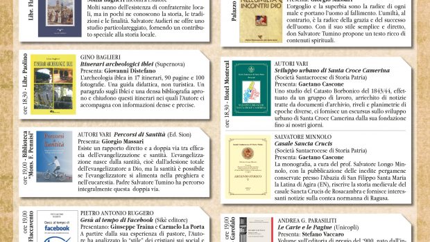 Religiosità, fede e spiritualità sono tra i temi forti della giornata di oggi del festival letterario “Liberi a Ragusa”. Dopo la giornata inaugurale di ieri, si inizia a respirare il profumo della carta e dell’inchiostro. Otto i volumi che saranno presentati. Tra questi due ruotano attorno alla spiritualità di don Salvatore Tumino. Ma ci sarà spazio anche per la storia delle confraternite di Vittoria o al rapporto tra i credenti e i social media. Si inizia alle 17 alla libreria Flaccavento con “Le confraternite a Vittoria”, un’opera di Salvatore Audieri, pubblicata dalla Baglieri Edizioni, con Sonia Baglieri che incontra l’autore; alle 18, a Palazzo Garofalo, Giorgio Massari presenta “Nell’umiltà dell’incontro con Dio” una pubblicazione postuma di don Salvatore Tumino, edita dal Rinnovamento nello Spirito; alle 18.30, alla libreria Paolino, Giovanni Di Stefano presenta la guida didattica “Itinerari archeologici iblei” di Gino Baglieri, pubblicata da Supernova; alle 18.30, all’hotel Montreal, due appuntamenti con la Società Santacrocese di Storia Patria e con Gaetano Cascone che illustra uno studio del catasto borbonico e una monografia di Salvatore Minnolo sullo sviluppo urbano di Santa Croce Camerina e sul “Casale Sancta Crucis”; alle 19, alla biblioteca diocesana “Monsignor Pennisi”, Giorgio Massari presenta “Percorsi di santità”, della casa editrice “Sion”, ispirato ancora a don Salvatore Tumino; alle 19, alla libreria Flaccavento, Giuseppe Traina e Carmelo La Porta incontrano Pietro Antonio Ruggero, autore di “Gesù al tempo di Facebook” (Sikè editore); alle 19, infine, a Palazzo Garofalo, Stefano Vaccaro presenta “Le carte e le pagine” (Unicopli), un volume sull’editoria di pregio del Novecento nel quale l’autore Andrea G. Parasiliti si occupa delle più importanti riviste futuriste edite in Sicilia.