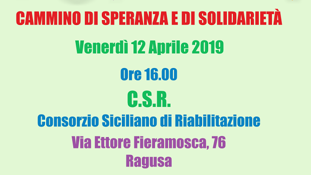 Via Crucis vivente realizzata dai diversamente abili del C.S.R. di Ragusa e dagli operatori del centro. Nella locandina emerge una carrozzina legata alla Croce e una corda spezzata. A simboleggiare la libertà dei fratelli e sorelle disabili quando la Croce è tolta dalle loro spalle. Questo diventa possibile soltanto quando sul nostro cammino incontriamo la solidarietà, il sostegno, la partecipazione sociale.