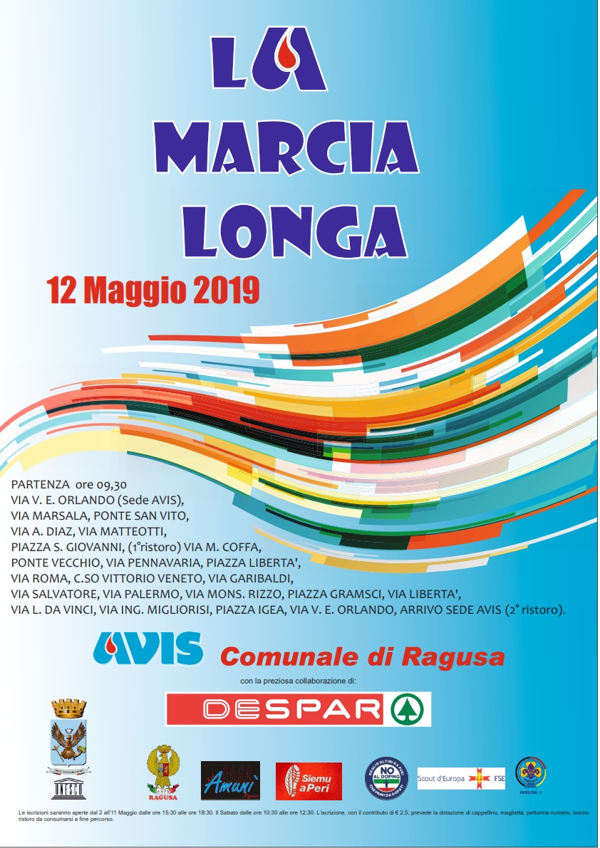 Il 12 maggio si terrà la dodicesima edizione della Marcia Longa dell’Avis. Appuntamento annuale che si rinnova, organizzato per sensibilizzare la cittadinanza alla donazione del sangue. Partenza prevista alle 9.30 dalla sede dell’Avis in via V.E. Orlando. Il percorso che si diramerà tra le vie del centro cittadino, prevede due punti ristoro, in piazza San Giovanni e al termine del percorso nuovamente presso la sede Avis. Sarà un’occasione di sport e divertimento. Iscrizione aperte presso la sede di Ragusa dalle 15.30 alle 18.30 di tutti i giorni che precedono l’evento. L’iscrizione, con il contributo di € 2.50 prevede la dotazione di cappellino, maglietta, numero e buono ristoro da consumarsi a fine percorso.