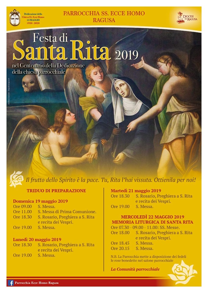 Giorno 22 Maggio in occasione della festa di santa Rita, l’Ufficio per la pastorale della Salute della Diocesi di Ragusa, in collaborazione con l’Asp, ha organizzato una S. Messa per i malati e i sofferenti con benedizione delle rose presso la parrocchia SS. Ecce Homo, Ragusa, nel Centenario della Dedicazione della Chiesa Parrocchiale.