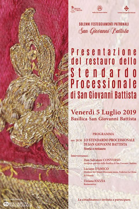 Venerdì 5 luglio alle 20.30, presso la Basilica di San Giovanni Battista, lo Stendardo verrà presentato e restituito alla comunità. Don Salvatore Converso, Luciano D’Amico, direttore del Museo diocesano Mons. Federico La China di Vittoria, e la restauratrice del manufatto Tiziana Iozzia, esporranno la secolare storia e i lavori di restauro richiesti del prezioso Manufatto. Domenica 7 luglio finalmente lo Stendardo tornerà ad aprire e ad indicare la via alla processione cittadina in onore di San Giovanni Battista.