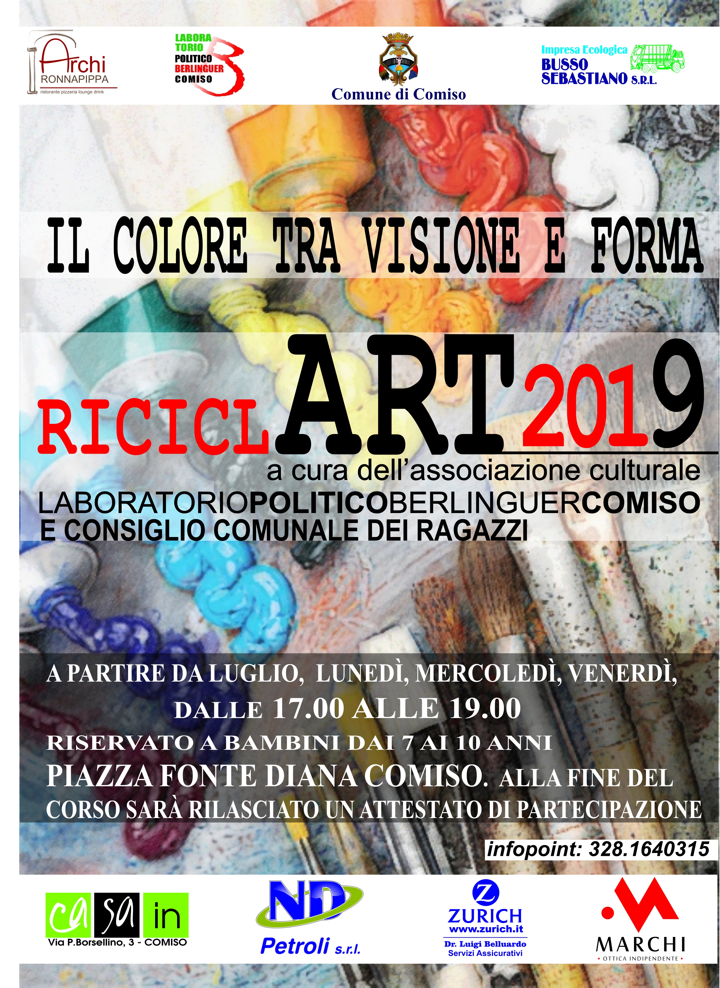 Mercoledì 10 Luglio 2019 alle ore 17 riparte la manifestazione “RICICLART2019, un laboratorio didattico creativo, che vede nel riciclo della materia un percorso educativo e innovativo attraverso il quale trasmettere ai più piccoli il rispetto e la cura dell’ambiente.