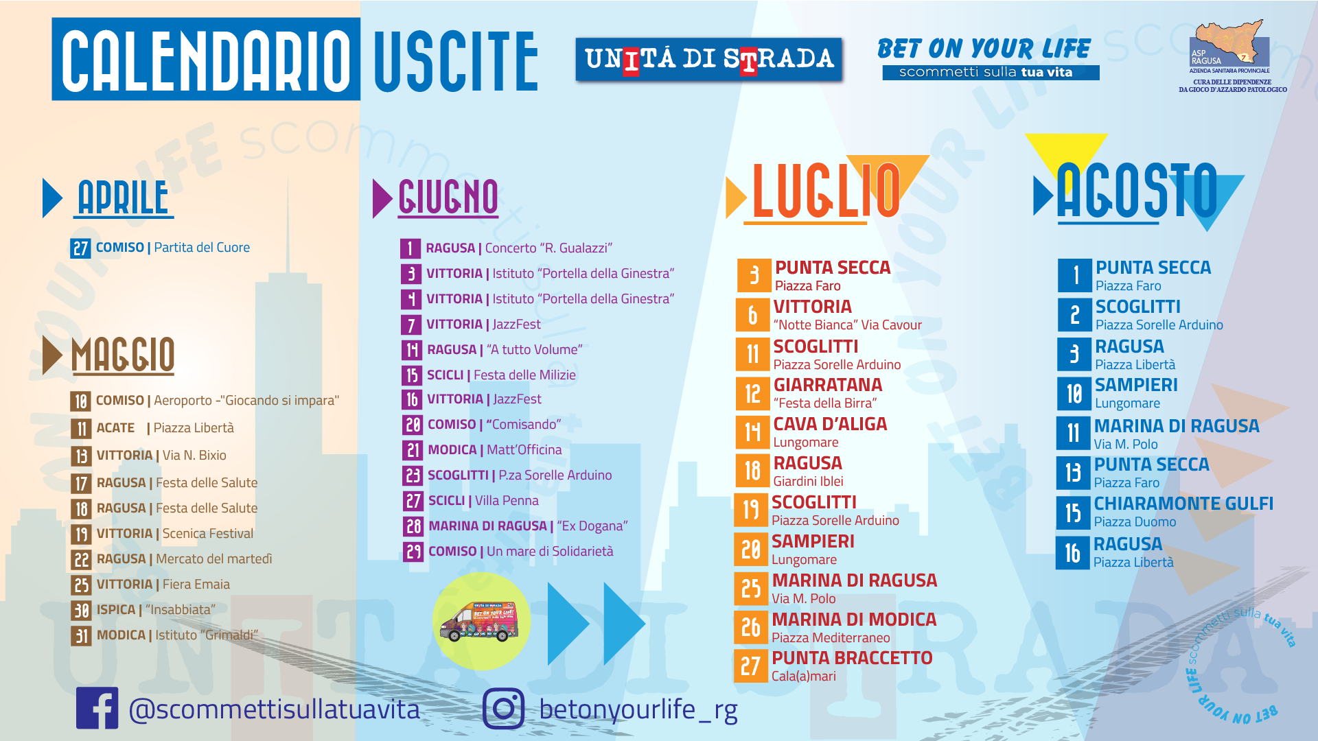 L’Unità di Strada con i propri operatori offre, per chi ne avesse intenzione, un primo supporto a tutti colori che vorranno avere informazioni più precise sui rischi delle dipendenze. La possibilità di raggiungere gli utenti direttamente nei luoghi di villeggiatura e/o svago rientra nella strategia dell’U.O.C. Dipendenze Patologiche (Ser.T. Vittoria – Modica – Ragusa) di essere un punto di rifermento visibile e discreto per consentire a chiunque di conoscere e richiedere un supporto. A sostegno delle attività sul territorio sono stati creati i seguenti canali social su Facebook e Instagram.