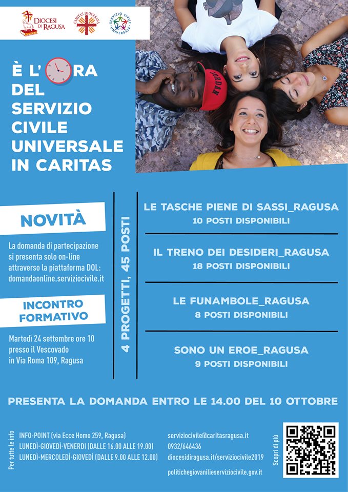 La Caritas diocesana di Ragusa è presente con 4 progetti per un totale di 45 posti. Per illustrare i progetti della Caritas e le nuove modalità di presentazione della domanda è previsto un incontro informativo che si terrà martedì 24 settembre alle ore 10.00 presso il Vescovado di Ragusa in Via Roma, 109. Presso il Centro Ascolto di Via Ecce Homo, 259 a Ragusa sarà attivo un Info-point per ricevere informazioni sul bando e sulla possibilità di svolgere tirocinio osservativo presso le sedi di progetto. L’info point risponde al numero 0932/646436 e alla mail serviziocivile@caritasragusa.it e sarà aperto con il seguente calendario da lunedì 9 settembre: lunedì – giovedì – venerdì (dalle 16.00 alle 19.00), lunedì – mercoledì – giovedì (dalle 9.00 alle 12.00).