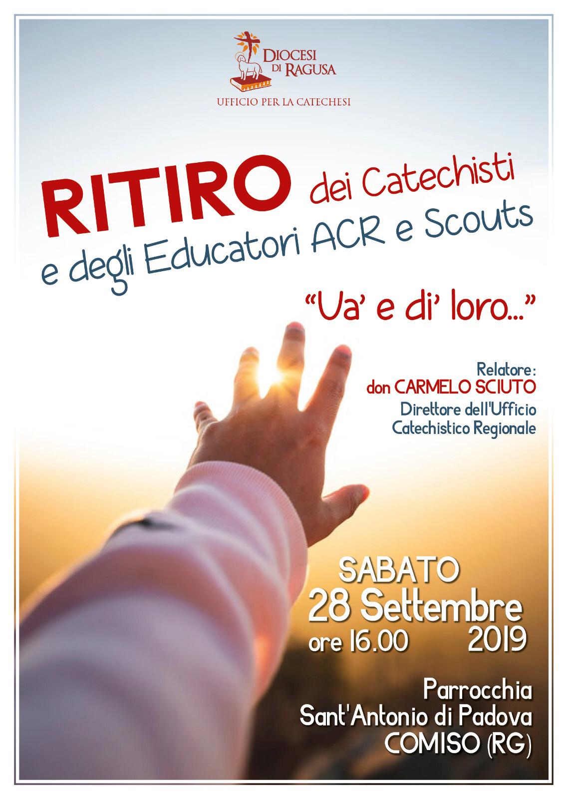 Per iniziare insieme l’anno con un momento di spiritualità, tutti i Catechisti e gli Educatori ACR e Scout della diocesi sono invitati a partecipare al ritiro che si terrà sabato 28 settembre alle ore 16:00 presso la parrocchia Sant’Antonio di Padova a Comiso.