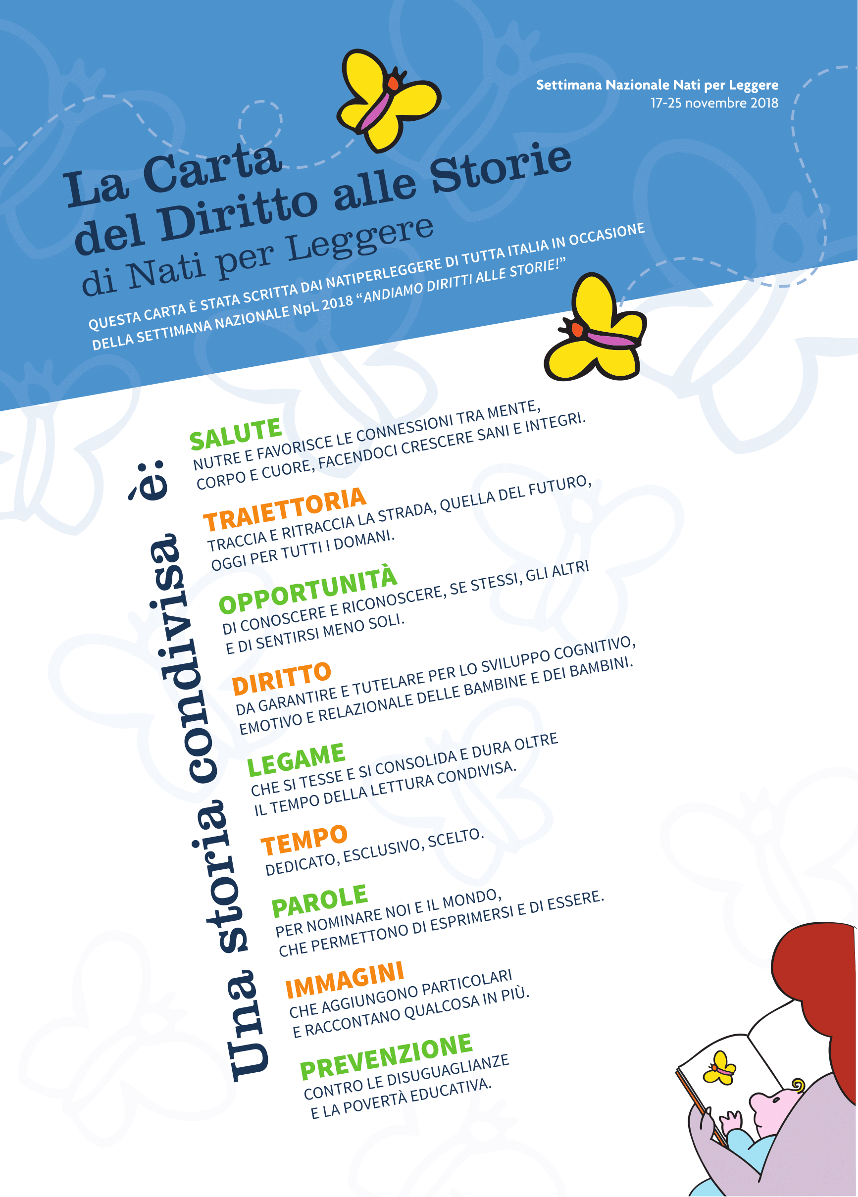 Nel 2014 è stata istituita la Settimana nazionale Nati per Leggere “Andiamo Diritti alle Storie!”, per tutelare il diritto alla lettura di bambini e bambine. Quest’anno è stata istituita dal 16 al 24 novembre, data scelta non a caso, ma in concomitanza con la Giornata Internazionale dei diritti dell’infanzia e dell’adolescenza, che cade il 20 novembre. Ogni bambino ha il diritto di essere protetto, non solo dalla malattia e dalla violenza ma anche dallo svantaggio socio culturale e dalla povertà educativa. Ed è possibile farlo grazie alle pagine dei libri e alle parole delle storie, fonte inesauribile di stimoli che, se offerti precocemente e con continuità, incidono profondamente sull’itinerario di vita di un bambino.