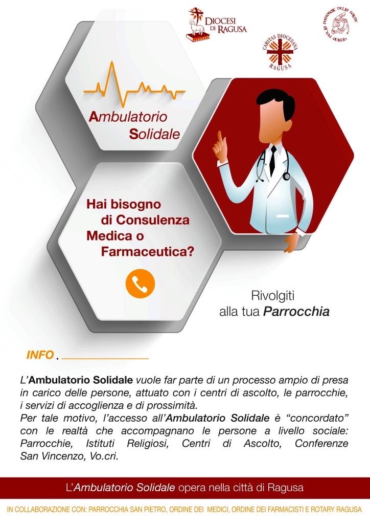 Nei locali della parrocchia San Pietro è attivo un ambulatorio solidale. Il servizio è promosso dalla Caritas e dall’Ufficio di Pastorale della Salute, con la collaborazione degli Ordini dei medici e dei farmacisti e del Rotary. L’ambulatorio è essenzialmente un centro di ascolto sanitario con funzione di consulenza e orientamento per tutte quelle persone che non sanno come accedere ai servizi sanitari. Si offrono, dunque, consulenze in collaborazione con le istituzioni sanitarie e si forniscono gratuitamente farmaci di base. L’ambulatorio solidale è attivo a Ragusa in via Umbria 1 (nei locali adiacenti alla parrocchia San Pietro) tutti i mercoledì e venerdì dalle 10 alle 12. L’ambulatorio solidale è una risposta a una esigenza evidenziata negli ultimi anni dall’Osservatorio delle Povertà e delle risorse della nostra Diocesi . È emerso un disagio sempre crescente sul versante sanitario. Si tratta di una una povertà “poco visibile” che riguarda in prevalenza anziani e migranti, ma anche una fascia considerevole di famiglie italiane. Una povertà senza vie di mezzo: o si chiede aiuto o non ci si cura. Come avvenuto già per il Ristoro San Francesco, anche l’ambulatorio solidale non è una risposta autosufficiente, ma vuole far parte di un processo più ampio di presa in carico delle persone, attuato con i centri di ascolto, le parrocchie, i servizi di accoglienza e di prossimità.