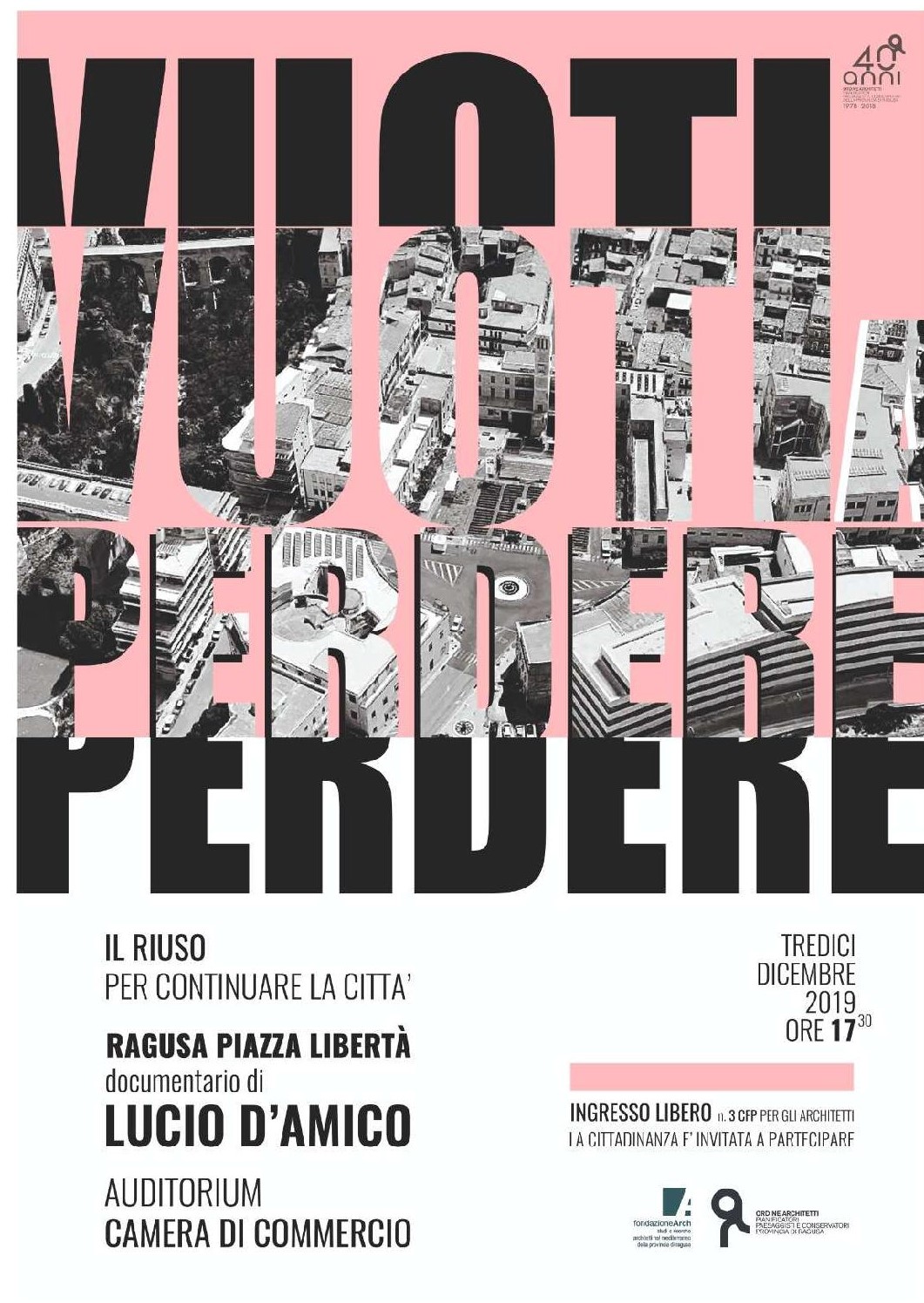Un’interessante iniziativa organizzata dall’Ordine Architetti Ragusa e dalla Fondazione Architetti Ragusa, venerdì 13 dicembre a partire dalle ore 17,30 presso l’auditorium della Camera di Commercio è prevista la proiezione del docufilm dell’Arch. Luciano D’Amico su Piazza Libertà “Vuoti a perdere”. L’ingresso è libero e seguirà un dibattito moderato dall’arch. Paolo Mincio.