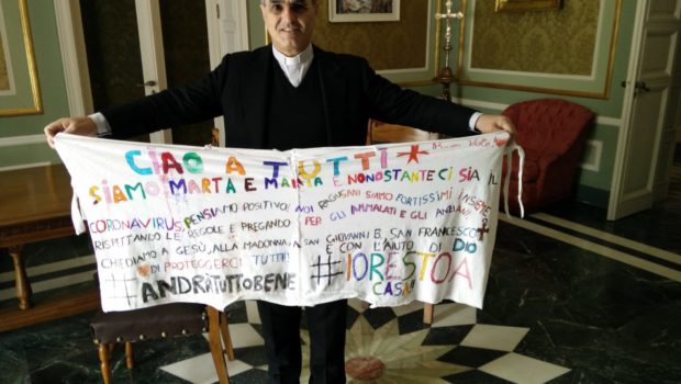 Anche la diocesi ha aderito alle iniziative #andràtuttobene. Il vescovo ha esposto sul balcone del suo studio un lenzuolo che richiama lo slogan che sta colorando tutti i balconi. Uno striscione di #andràtuttobene è stato collocato in cima alle scale nobili dell’ingresso del Vescovado. È stato donato al vescovo da due gemelle, Marta e Maria, coccinelle del gruppo Ragusa 3 della Federazione Scout d’Europa. Monsignor Cuttitta le ha ringraziate, mostrando di aver apprezzato molto il dono.