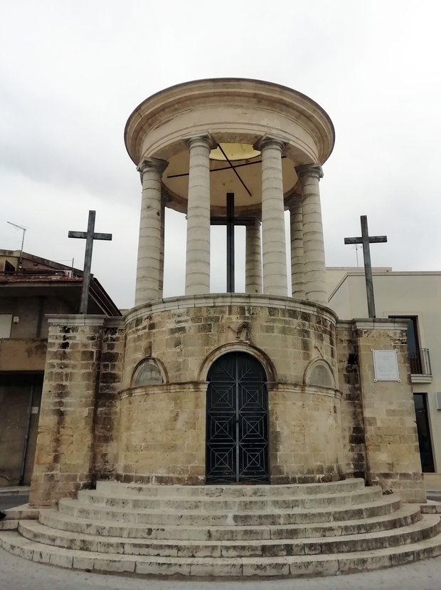 In merito all’anno di realizzazione mi sento di poter affermare che si tratta del 1959. Rammento che questo Calvario fu costruito dopo il 1859 (in sostituzione di quello antico) a conclusione di una missione di padri Cappuccini (mons. La China). Per molti anni rimase incompleto, ad esempio la cupola doveva essere in muratura, invece ne è stata sistemata una in plexiglas negli anni ’90 (Emanuele Ingrao); e ancora le pareti della cappellina sono state decorate nel 1914 e le lunette esterne come si evince da antiche foto erano vuote. Quindi sono state “riempite” dopo ben cento anni.