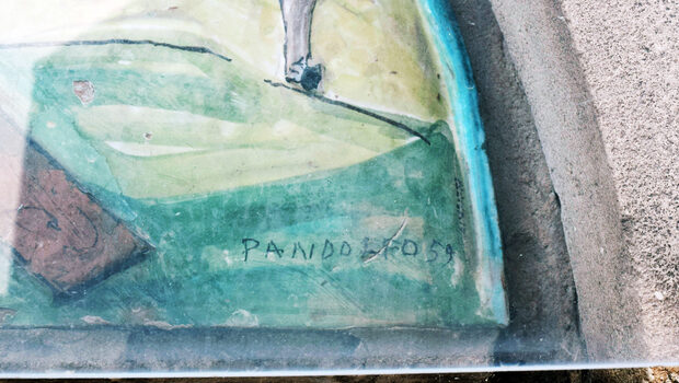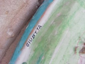 Dopo altri sopralluoghi e con l’ausilio di una scaletta, ho rilevato una seconda firma, quest’ultima presente in tutti i cinque pannelli, si tratta di Giuditta, cognome poco noto in Sicilia.