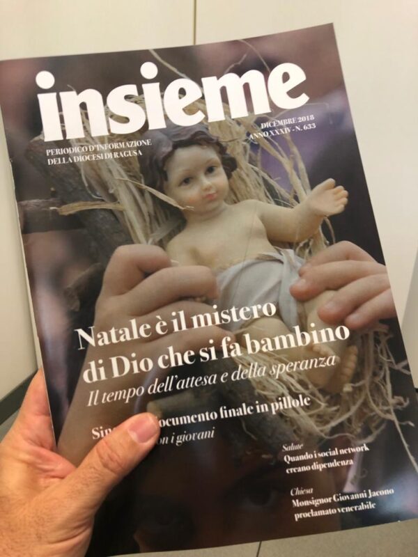 Con il numero di dicembre 2018, trentacinquesimo anno dalla pubblicazione del numero zero, Insieme cambiava vestito. Fu proprio monsignor Carmelo Cuttitta a “battezzare” la rivista, presentando alla diocesi ed alla stampa il nuovo formato grafico che sostituiva il foglio monocromatico. Il vescovo Carmelo gratificò tutti gli sforzi compiuti dall’Ufficio per le Comunicazioni Sociali definendo la nuova rivista «Un dono per la nostra comunità», «un valore aggiunto» che avrebbe favorito la lettura e la diffusione del mensile diocesano. Chi vi scrive, fresco della nomina a direttore dell’Ufficio, condivideva la soddisfazione della neonata rivista con i precedenti direttori, Giampiero Saladino e Simone Digrandi. Mi rimase particolarmente impresso il gesto di monsignor Cuttitta che, fuori dall’ufficialità della conferenza stampa, sfogliando il numero, in cui campeggiava in copertina un bellissimo Gesù Bambino, ebbe ad esclamare: “Accattivante!”. Monsignor Cuttitta non è uomo dei superlativi, sempre misurato nelle espressioni, senza esaltazioni emotive. È quindi puntuale e preciso nei giudizi e nei termini che usa e compresi che quel giudizio era espressione del suo gradimento della forma e della sostanza.
