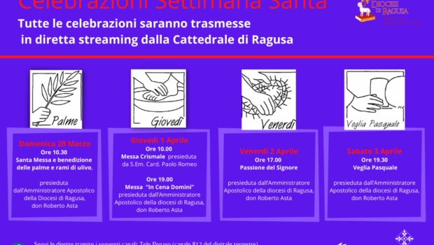 Sarà possibile seguire in diretta streaming dalla Cattedrale le celebrazione della Settimana Santa attraverso i seguenti canali: Tele Pegaso (canale 812 del digitale terrestre), www.cattedraletv.it, www.diocesidiragusa.it, www.insiemeragusa.it, www.radiokaris.it, le pagine Facebook di Cattedrale S. Giovanni Battista – Ragusa, Diocesi di Ragusa, Insieme Ragusa e Radio Karis inBlu; sul Canale Youtube di Radio Karis Ragusa e sulle frequenze FM 87.8 e 99.3 di Radio Karis inBlu