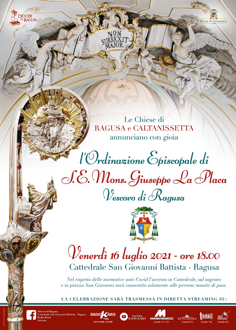 Manca poco meno di un mese all’ordinazione episcopale di monsignor Giuseppe La Placa, eletto vescovo di Ragusa lo scorso 8 maggio da Papa Francesco. Le Diocesi di Ragusa e Caltanissetta sono impegnate a mettere a punto tutti i dettagli organizzativi della cerimonia che si terrà venerdì 16 luglio, alle 18, nella cattedrale San Giovanni Battista. Un’organizzazione resa più complessa dalle normative anti Covid che, se non interverranno ulteriori disposizioni legislative, consentiranno l’accesso in cattedrale e nel sagrato, dove verranno attivati degli appositi schermi, solo a un numero contingentato di fedeli. La celebrazione sarà comunque trasmessa in diretta radiotelevisiva e in streaming.