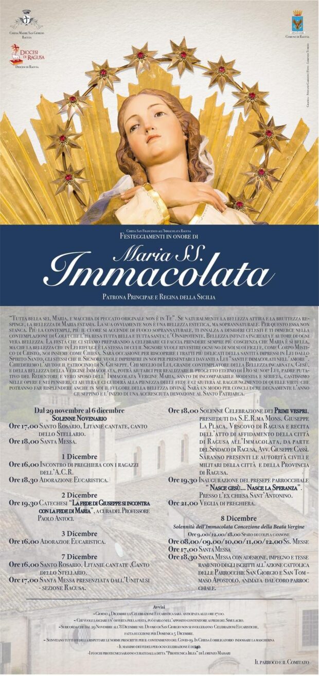 Che significato ha questo atto di affidamento di Ragusa e dei ragusani a Maria SS Immacolata? Rappresenta il mezzo efficace per rimanere fedeli alle promesse battesimali e perseverare nell’esercizio delle virtù. San Bernardo così si esprime: «Se Maria ti sorregge non cadi; se ti protegge non devi temere; se ti conduce non ti stanchi; se ti è favorevole, tu arrivi al porto della salvezza». Per questo, assicurarci la particolare protezione di Maria Madre di tenerezza e di misericordia, è un atto di particolare ossequio in cui ci doniamo interamente a Lei per onorarla e per servirla e le offriamo tutto quanto abbiamo di più caro e di più prezioso. Lei, sicuramente ripaga con le Sue grazie le nostre pochezze, ci fa conoscere la potenza della sua intercessione, ci comunica le Sue virtù. Maria, ama i Suoi figli, ama la nostra città.