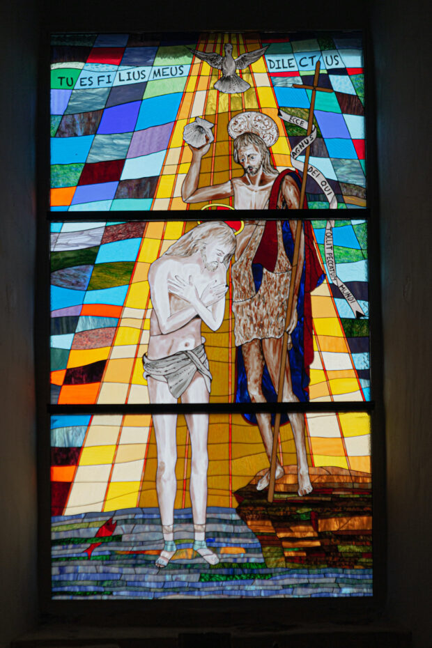 L’opera, donata da monsignor Carmelo Ferraro, arcivescovo metropolita emerito della diocesi di Agrigento e parroco della basilica tra il 1962 ed il 1978, è stata realizzata dal maestro vetraio Giovanni Biondo su disegno del noto artista vittoriese Arturo Barbante e raffigura il Battesimo di Gesù per mano di San Giovanni.