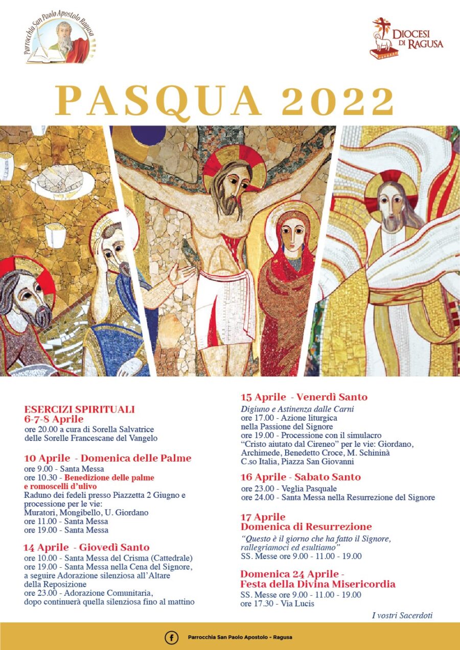 La parrocchia San Paolo di Ragusa presenta una serie di incontri per tutto il mese di Aprile per celebrare la Pasqua. Si inizia settimana prossima con gli esercizi spirituali, giorno 6-7-8 alle ore 20, a cura di Sorella Salvatrice delle sorelle Francescane del Vangelo.