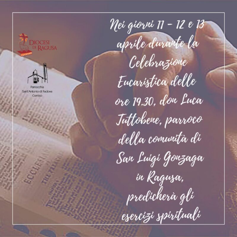 Duranti i giorni di celebrazione eucaristica dell’11,12 e 13 aprile don Luca Tuttobene, parroco di San Luigi Gonzaga, organizza una serie di incontri per predicare esercizi spirituali. Gli esercizi verranno praticati presso la parrocchia Sant’Antonio di Padova a Comiso a partire dalle ore 19.30.