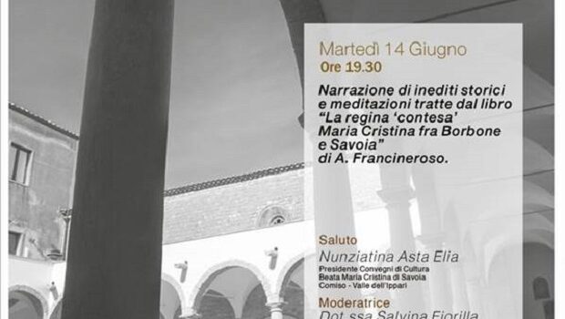 Proseguono martedì 14 giugno (ore 20) i suggestivi “Racconti nel chiostro” con una serata interamente dedicata alla lettura e meditazione su inediti della Beata Maria Cristina di Savoia. L’iniziativa è promossa dall’Ufficio per la cultura della Diocesi di Ragusa, dal Santuario dell’Immacolata di Comiso e da Convegni di Cultura “Beata Maria Cristina di Savoia” (Comiso – Valle dell’Ippari) e consta di 3 serate tra cultura e spiritualità, caratterizzate dalla lettura di passi significativi tratti da opere pubblicate da donne della nostra terra e non, opportunamente corredate di accompagnamento musicale e commento teologico. Ad accompagnare la lettura dell’attrice Tiziana Bellassai, sarà il M° Danilo Ferro di Vittoria con brani di alto livello stilistico. Mentre il commento teologico sarà curato da p. Biagio Aprile e dal prof. Giuseppe Di Mauro. Ad introdurre il presente appuntamento sarà Nunziatina Asta Elia, presidente del Maria Cristina di Comiso – Valle dell’Ippari. La relatrice di questo secondo incontro sarà la dott.ssa Salvina Fiorilla.