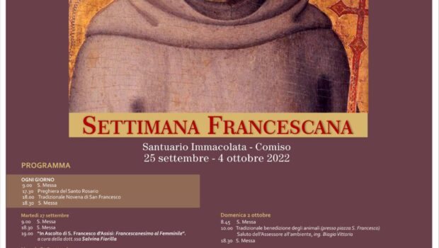 Riflessioni, interazioni, scoperta, fraternità e spiritualità saranno al centro dell’ormai consueta Settimana Francescana organizzata presso il Centro Pastorale Francescano per il Dialogo e la Pace di Comiso (Santuario dell’Immacolata, via degli studi 56). L’iniziativa è organizzata dall’Ufficio per la cultura della Diocesi di Ragusa in collaborazione con i Frati minori conventuali e la comunità francescana del Santuario dell’Immacolata, e si svolgerà da oggi 27 settembre a martedì 4 ottobre, con ingresso libero aperto a tutti. Il primo incontro verrà curato dalla dott.ssa Salvina Fiorilla, la quale tratterà il tema del “Francescanesimo al femminile, attraverso un confronto tra la figura storica di Chiara d’Assisi e il ritratto antropologico offerto in chiave contemporanea dalla scrittrice Dacia Maraini. Il secondo incontro, verrà tenuto dalla dott.ssa Domenica Donzelli (ministra dell’O.F.S. di Comiso) la quale affronterà “Il senso della Provvidenza di Dio in un tempo di incertezze e di inquietudini”. La terza e ultima serata sarà costituita dal tema “Il grido dei poveri e quello della terra, dall’ecologia integrale di papa Francesco, con interventi a cura del prof. Giuseppe Di Mauro, Raffella Refano e l’ins. Floriana Latino. Interverranno anche il percussionista Mirko Baglieri (handpan) e l’architetto Franco Baglieri con l’opera d’arte “Barriera corallina”. Tutte e tre le serate saranno corredate dalla suggestiva lettura di brani antologici a cura dell’attrice Tiziana Bellassai.
