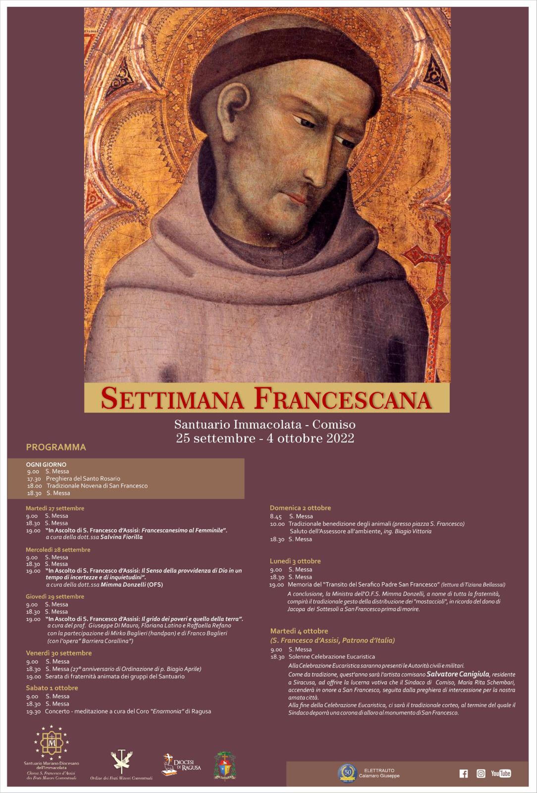 • Il 4 Ottobre la grande festa e la solenne celebrazione delle ore 18.30 in cui verrà offerta la “lucerna votiva” dell’artista comisano Salvatore Canigiula, accesa dal sindaco di Comiso, la prof.ssa Maria Rita Schembari, la quale offrirà subito dopo la preghiera di intercessione al Santo di Assisi per la protezione della città.