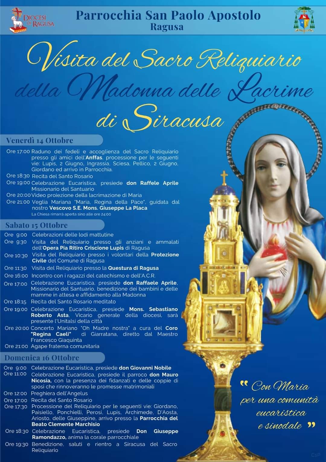 Tre giorni di grande intensità spirituale e momenti speciali per devoti e fedeli della parrocchia di San Paolo apostolo a Ragusa che grazie al suo parroco, don Mauro Nicosia, riceverà la visita del reliquiario della Madonna delle lacrime di Siracusa.