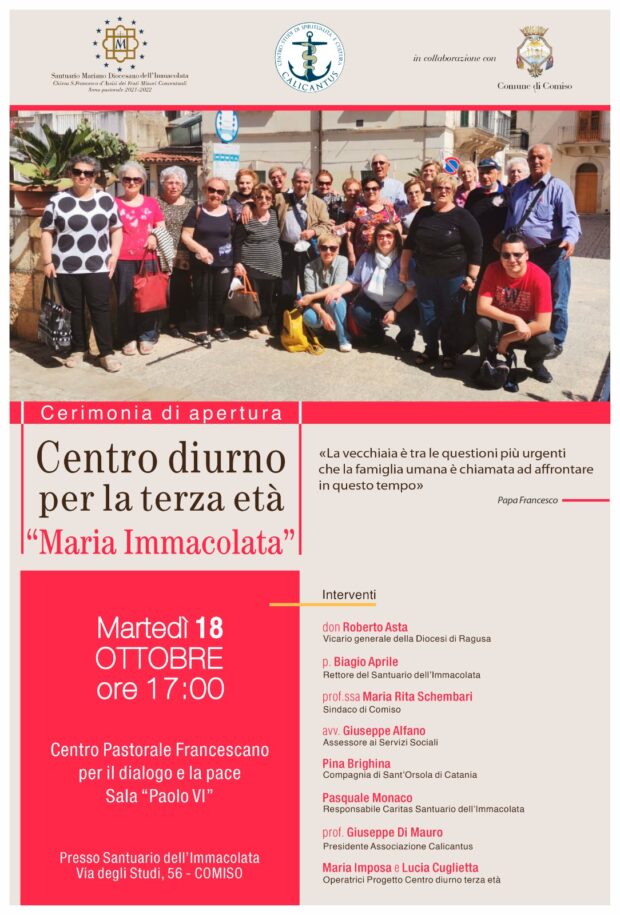 «La vecchiaia è tra le questioni più urgenti che la famiglia umana è chiamata ad affrontare in questo tempo». Queste parole di papa Francesco sono state da guida per un progetto che “rinasce” al suo quinto anno di vita, dopo aver attraversato i difficili anni della pandemia. Grazie ai frati dello storico Convento “S. Francesco all’Immacolata” di Comiso, alla generosità dei laici dell’Associazione Calicantus che quotidianamente si spendono richiamati dall’amore di Cristo nella carne dei fratelli più deboli, con la collaborazione del Comune di Comiso, si consolida il Centro diurno per la terza età che assumerà il titolo di “Maria Immacolata”. La cerimonia di inaugurazione si svolgerà nella suggestiva Sala “Paolo VI” sita nel medesimo plesso, alla presenza delle autorità religiose e civili, e degli attori sociali che hanno animato l’iniziativa.