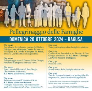 La giornata si aprirà alle 9.30 con l’accoglienza dei pellegrini al Giardino Ibleo con il saluto del sindaco Giuseppe Cassì e del vescovo monsignor Giuseppe La Placa. Seguirà il pellegrinaggio verso il duomo di San Giorgio dove è previsto un momento di riflessione, coordinato dall’arcivescovo di Siracusa monsignor Francesco Lomanto, e guidato dalla relazione del vescovo di Noto, monsignor Salvatore Rumeo, sui percorsi pastorali, le sfide e le prospettive della famiglia missionaria e della Chiesa sinodale. Dopo le testimonianze di tre famiglie missionarie, alle 12, nel duomo di San Giorgio, sarà celebrata la santa messa, cui seguirà il pranzo a sacco. Alle 15.30 il tour con il trenino barocco alla scoperta di Ibla.