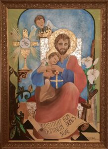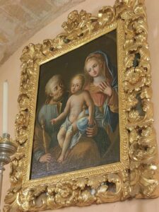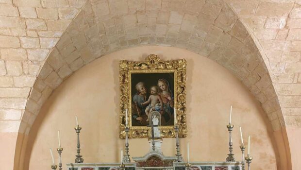 Chi ha avuto modo di entrare nella cappella nobiliare del castello di Donnafugata, sede della parrocchia Sant’Antonio Abate, avrà notato il bel quadro che troneggia in cima all’altare in marmo. Una tela graziosa, ben curata, ma non ho ancora notizie sulla sua provenienza e realizzazione. A prima vista sembrerebbe una Sacra Famiglia, e di fatto lo è, ma è principalmente un San Giuseppe raffigurato col Bambino seduto sulle sue ginocchia, accanto vi è la Sposa e Madre (un po’ indietro) che guarda con ammirazione l’intimità fra padre e figlio.