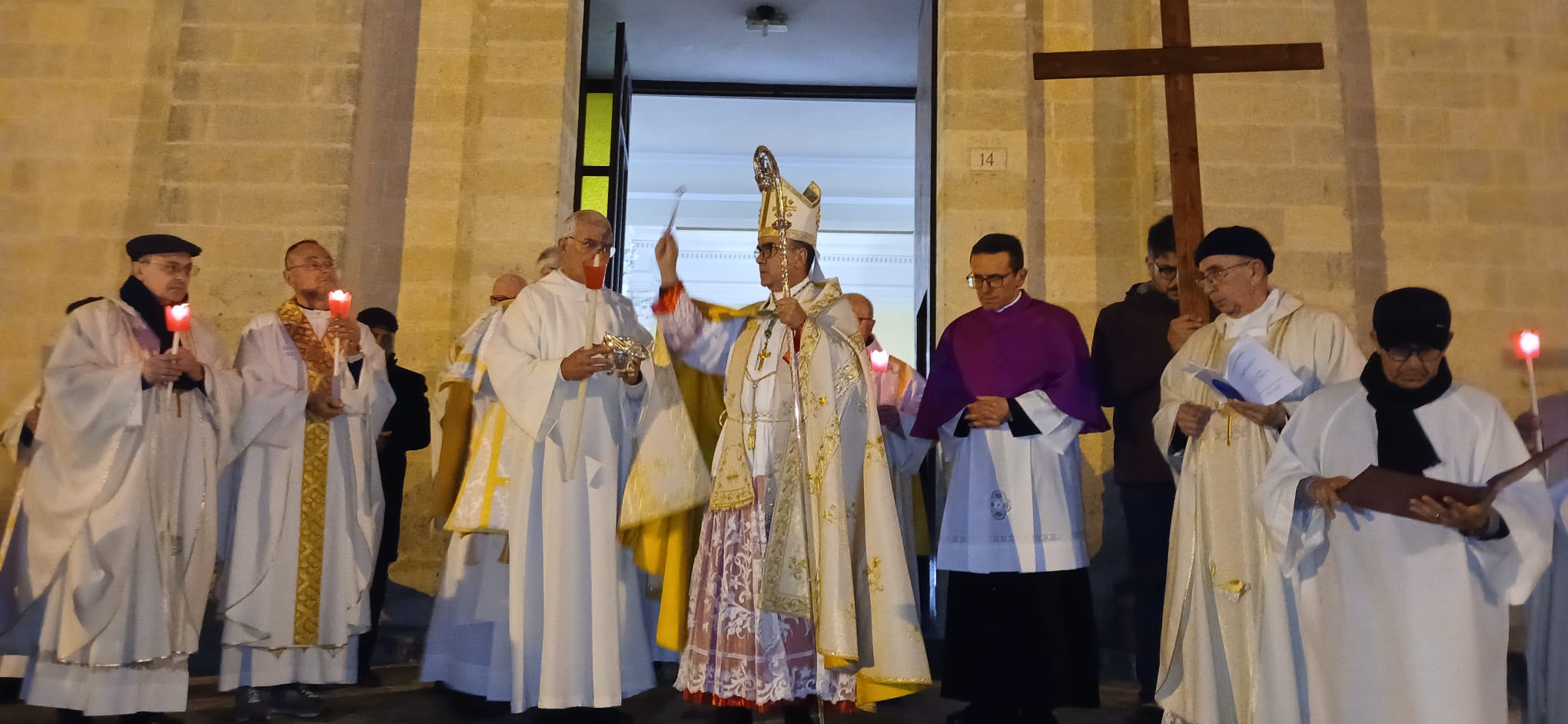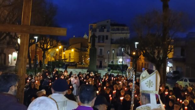 Radunati in piazza Cappuccini, davanti la chiesa di San Francesco D’Assisi, i consacrati, le consacrate e i fedeli con le candele accese, simbolo di Cristo, luce del mondo, hanno ricevuto la benedizione del Vescovo Giuseppe e in processione, proprio secondo le indicazioni date all’inizio dell’anno giubilare, è iniziato il pellegrinaggio verso la Cattedrale.
