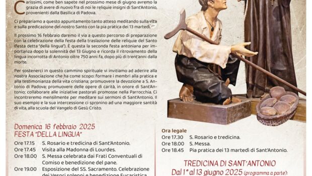 La celebrazione della festa della Lingua è stata presieduta da padre Daniel dei Conventuali di Comiso, è stata animata dall’associazione “I Gigli di Sant’Antonio” ed è stata preceduta dalla recita della tredicina. Durante la Messa è stato benedetto il pane poi distribuito ai fedeli. Nell’omelia il predicatore ha ricordato l’importanza di non avere lingue venefiche ma a gloria di Dio, come Sant’ Antonio.