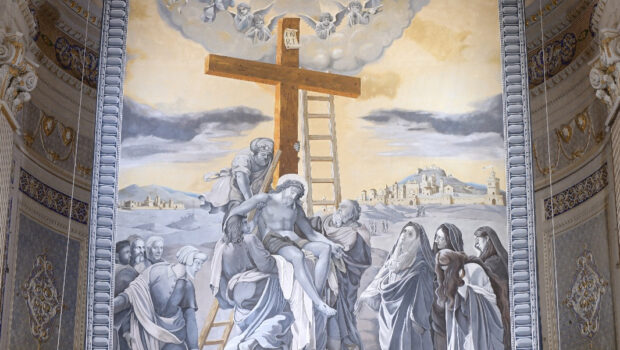 L’opera consiste in un maestoso dipinto su un tessuto di lino, alto 11 metri e largo 6 metri e mezzo, che rappresenta la Deposizione di Cristo dalla Croce.