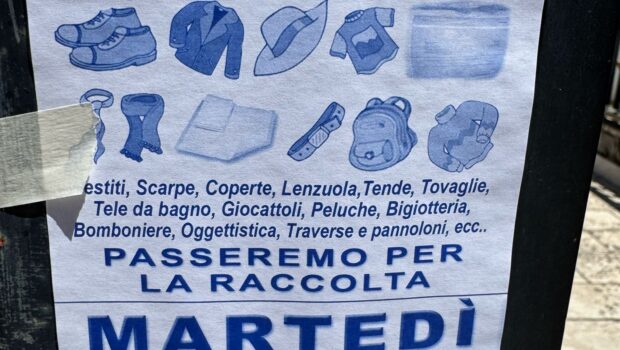 Attaccato col nastro adesivo, il volantino comunica la raccolta di indumenti usati. A leggere bene, oltre agli indumenti, i “raccoglitori” passeranno a prendere anche altro. E l’elenco è notevolmente lungo: scarpe, coperte, lenzuola, tende, tovaglie, teli da bagno, giocattoli, peluche, bigiotteria, bomboniere, oggettistica, traverse e pannoloni e poi, per non escludere nulla e mettersi al sicuro, si è aggiunto anche un “ecc.”. Praticamente tutto.